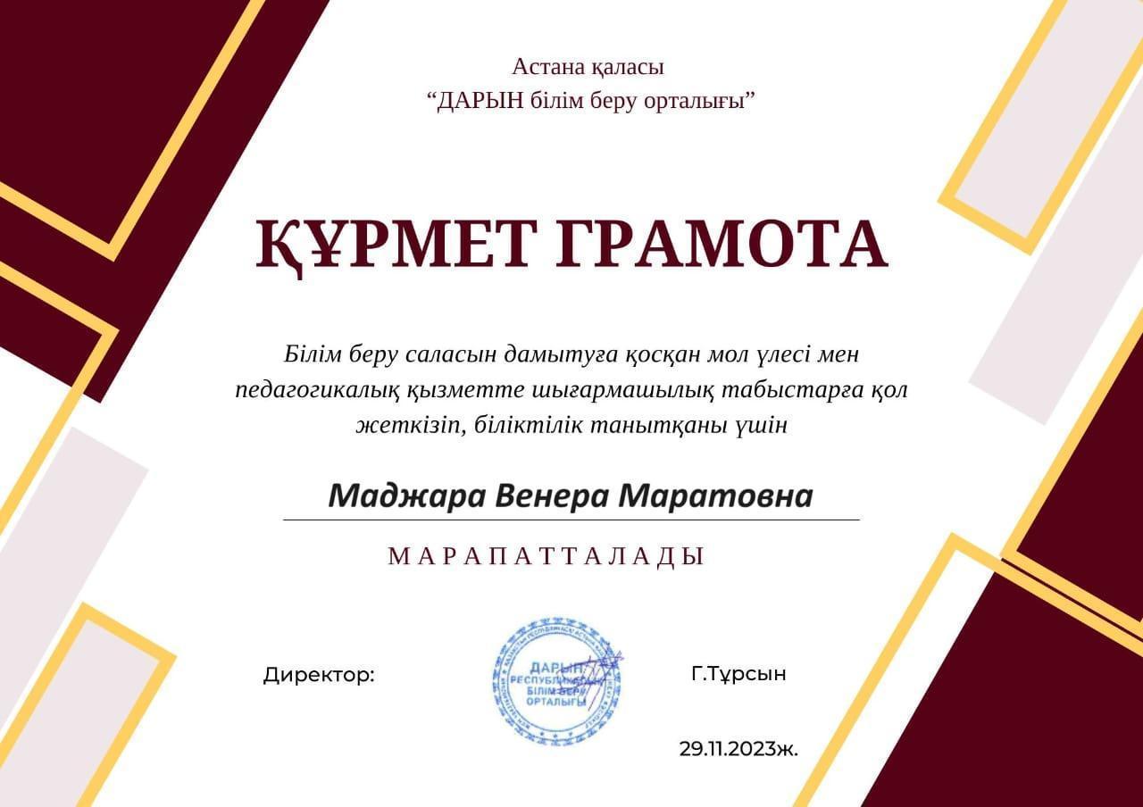 20 декабрь 2023 0 1 2 3 4 5 Маджара Венера Маратовна Астана қаласы "Дарын" білім беру орталығының ҚҰРМЕТ ГРАМОТАСЫМЕН марапатталды. Маджара Венера Маратовна Астана қаласы "Дарын" білім беру орталығының ҚҰРМЕТ ГРАМОТАСЫМЕН марапатталды. Осы беттің QR-коды:QR-код этой страницы: