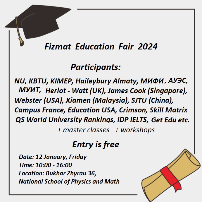 2024 жылғы 12 қаңтарда 10-11 сынып оқушылары "Fizmat Education Fair-2024 "білім көрмесі"көрмесіне барды. Бұл көрмеде Республикалық маңызы бар жоғары оқу орындары, сондай-ақ шетелдік жоғары оқу орындары болды. Жоғары оқу орындарының жалпы саны 20-дан асады.