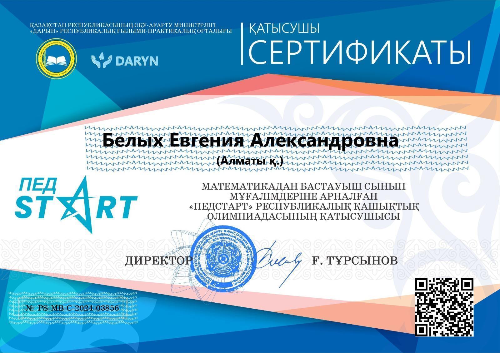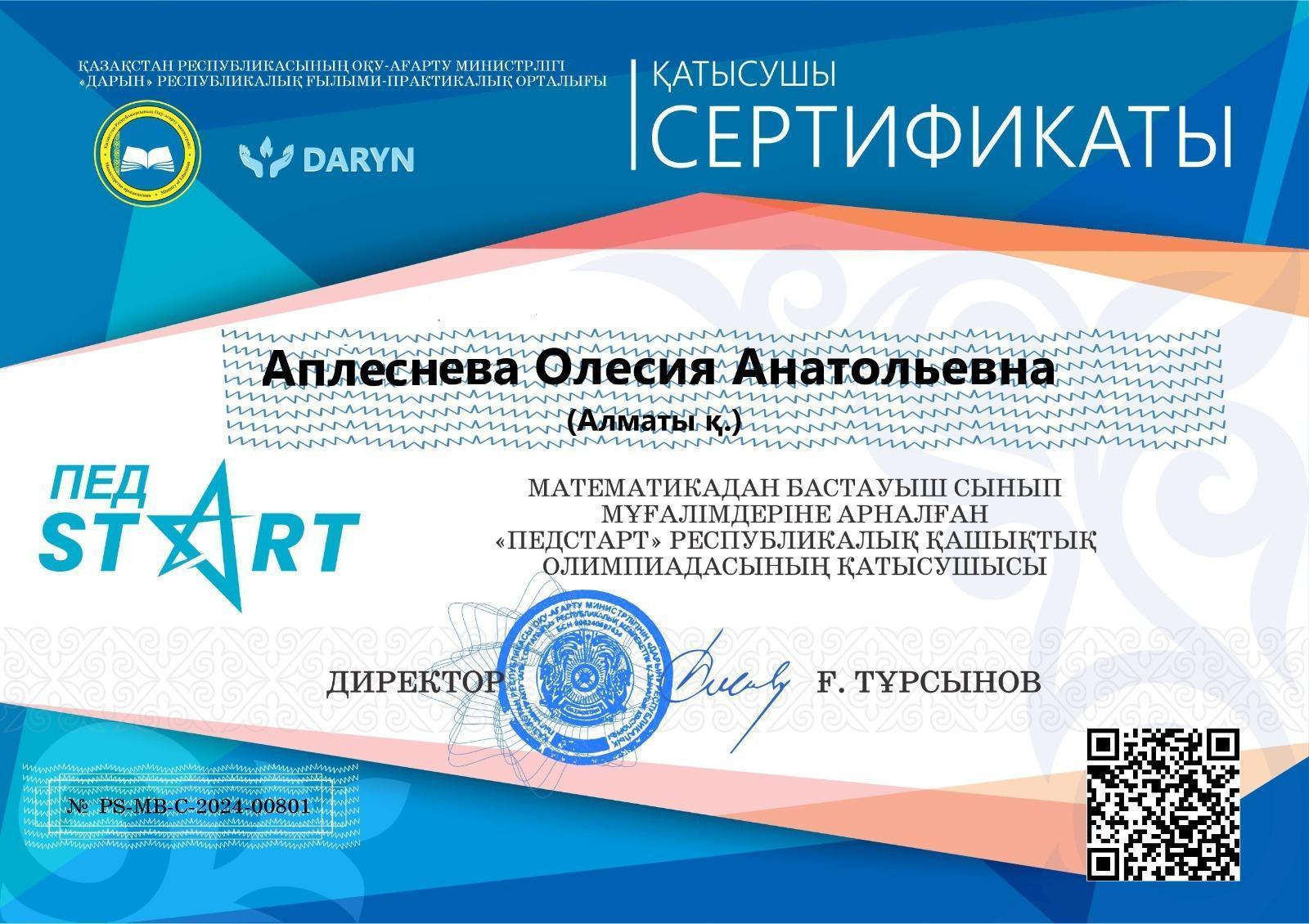 16 январь 2024 0 1 2 3 4 5 Математикадан бастауыш сынып мұғалімдеріне арналған “Педстарт “республикалық олимпиадасының сертификаты мен марапатталды. Математикадан бастауыш сынып мұғалімдеріне арналған “Педстарт “республикалық қашықтық олимпиадасының қатысушысы сертификаты мен марапатталды. Осы беттің QR-коды:QR-код этой страницы: