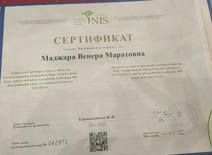 23 январь 2024 0 1 2 3 4 5 Мектеп басшыларының кадрлық резервіне енгізілгенін растайтын сертификаты мен Маджара В.М марапатталды. “Білім берудеғі өзгерістің 1000 көшбасшысы”жобасы аясында мектеп басшыларының кадрлық резервіне енгізілгенін растайтын сертификаты мен Маджара В.М марапатталды. Осы беттің QR-коды:QR-код этой страницы: