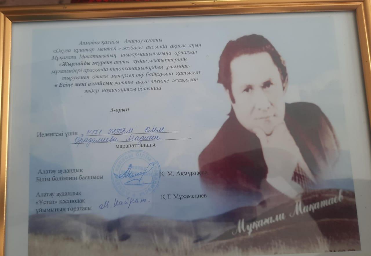 Оқуға құштар мектеп жобасы аясында ақиық ақын Мұқағали Мақатаевтың шығармашылығына арналған "Жырлайды жүрек" атты аудан мектептерінің мұғалімдері арасында кітапханашылардың ұйымдастырумен өткен мәнерлеп оқу байқауына қатысып ақын өлеңіне жазылған әндер номинациясы бойынша Оразалиева Мадина , Айымбекова Багила Т. lllорын иеленгені үшін марапатталады