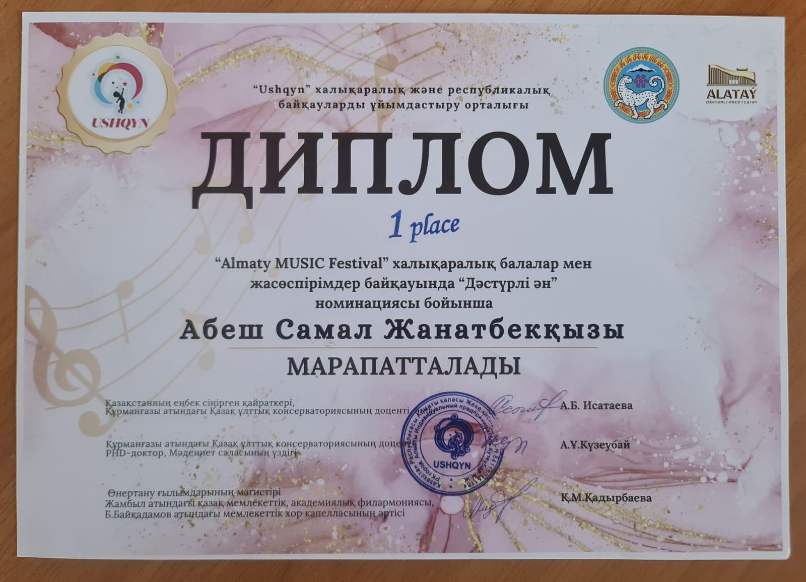 "Almaty Music Festival" халықаралық балалар мен жасөспірімдер байқауында Дәстүрлі ән номинациясы бойынша I-дәрежелі дипломмен Абеш Самал Жанатбекқызы марапатталды.