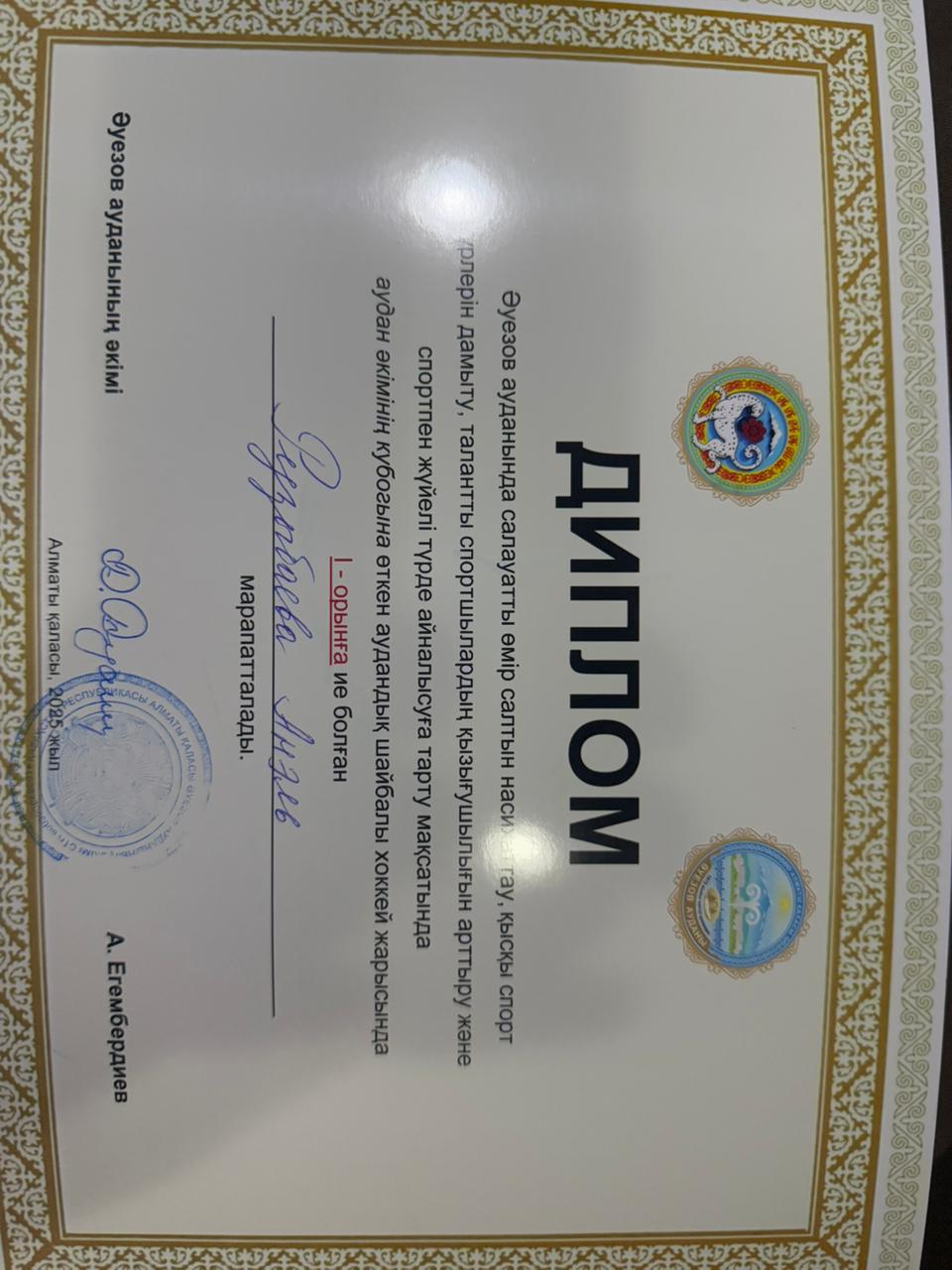 Әуезов ауданында салауатты өмір салтын насихаттау мақсатында аудан әкімінің аудандық кубогында өткен аудандық шайбалы хоккей сайысында I-орынға мектебіміздің оқушысы Рузыбаева Анель ие болды.