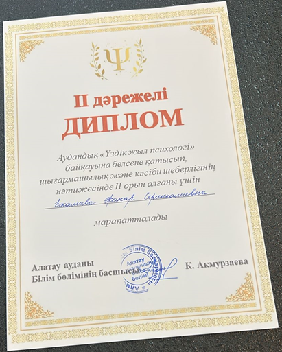 Аудандық "Үздік жыл психологі" байқауына белсене қатысып,шығармашылық және кәсіби шеберлігінің нәтижесінде II және III-орындармен мектебіміздің психологтері Ескалиева Жанар Сериккалиевна мен Диманбаева Дария Нуржановна марапатталды.