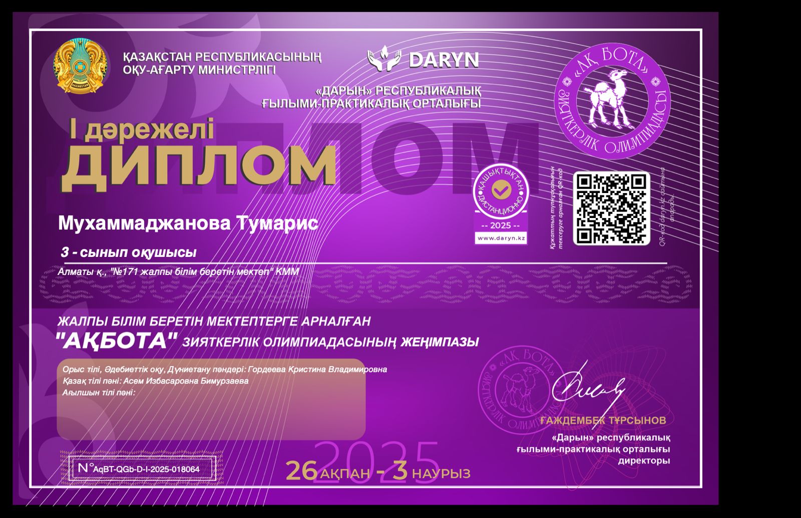 07 март 2025 0 1 2 3 4 5 "Ақбота" зияткерлік олимпиадасына қатысып,I-дәрежелі дипломға ие болғаны үшін марапатталды "Ақбота" зияткерлік олимпиадасына қатысып,I-дәрежелі дипломға ие болғаны үшін Ибрагимова Жасмин және Мухаммаджанова Тумарис марапатталды.Құттықтаймыз! Осы беттің QR-коды:QR-код этой страницы: