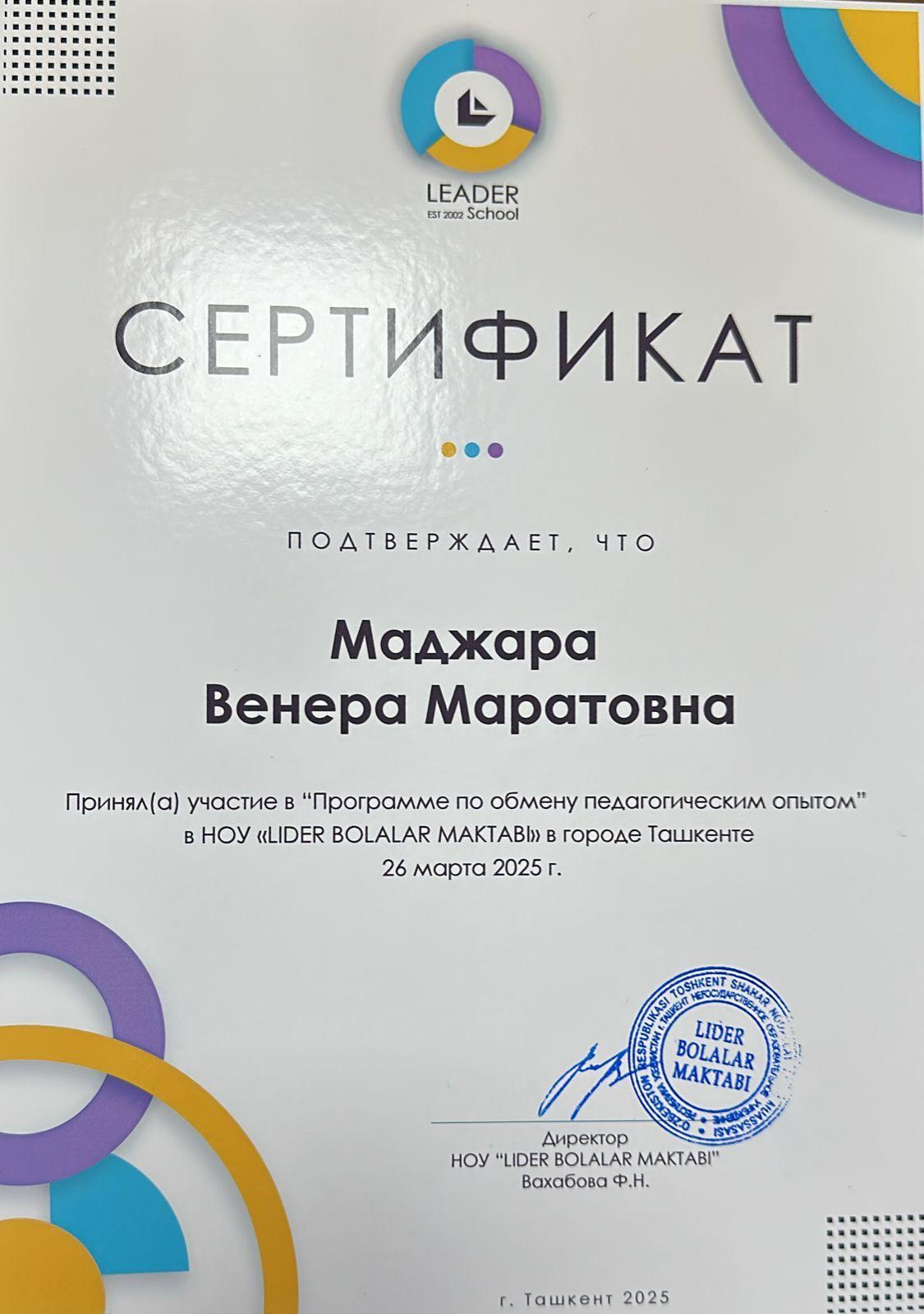 31 март 2025 0 1 2 3 4 5 "LIDER BOLALAR MAKTAB" қатысқаны үшін сертификатпен марапатталды Маджара Венера Маратовна Ташкентте өткен "Программа по обмену педагогическим опытом", "LIDER BOLALAR MAKTAB" қатысқаны үшін сертификатпен марапатталды. Осы беттің QR-коды:QR-код этой страницы: