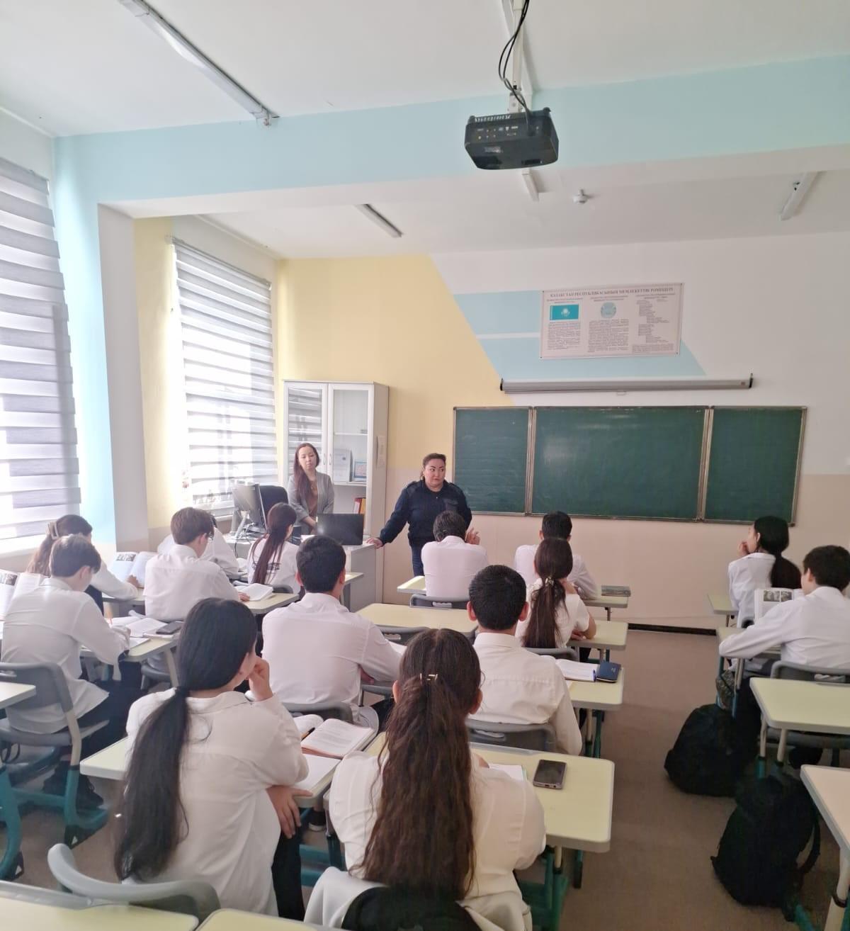 Участковый инспектор по делам несовершеннолетних капитан полиции Калиева Д.М. и старший участковый инспектор по делам несовершеннолетних майор полиции Канабатырова А.Т. совместно с заместителем директора по ВР Нурахановой С.Д. провели беседу с учащимися 8 класса на тему: «Административная и уголовная ответственность несовершеннолетних»
