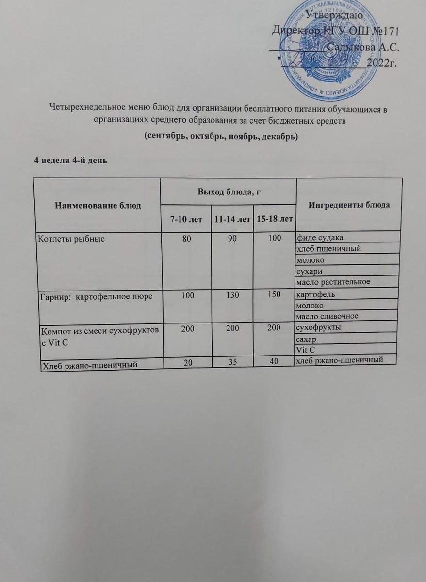 22 сентябрь 2022 0 1 2 3 4 5 Тағамдар мәзірі. 4 апта 4 күн (22.09.2022). Меню блюд. 4 неделя 4 день (22.09.2022) Осы беттің QR-коды:QR-код этой страницы: