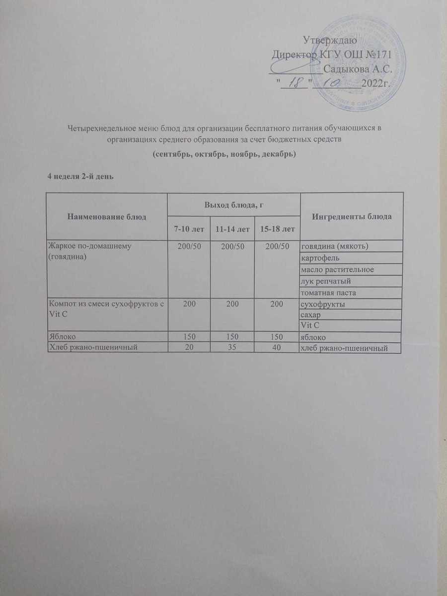 18 октябрь 2022 0 1 2 3 4 5 Тағамдар мәзірі. 4 апта 2 күн (18.10.2022). Меню блюд. 4 неделя 2 день (18.10.2022) Осы беттің QR-коды:QR-код этой страницы: