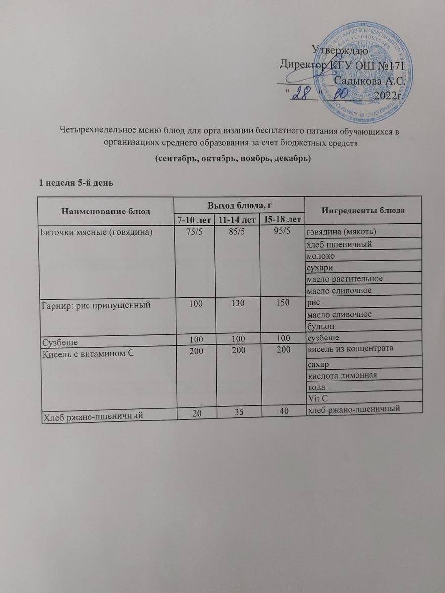 28 октябрь 2022 0 1 2 3 4 5 Тағамдар мәзірі. 1 апта 5 күн (28.10.2022). Меню блюд. 1 неделя 5 день (28.10.2022) Осы беттің QR-коды:QR-код этой страницы: