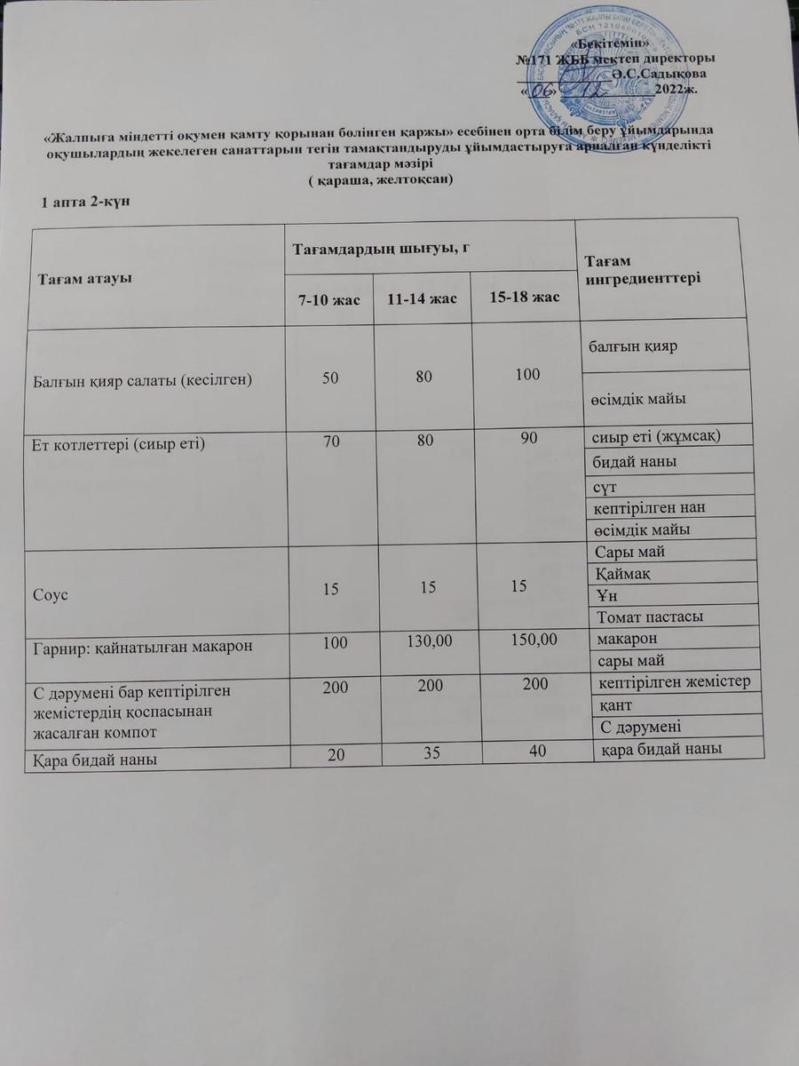06 декабрь 2022 0 1 2 3 4 5 Тағамдар мәзірі. 1 апта 2 күн (06.12.2022). Меню блюд. 1 неделя 2 день (06.12.2022) Осы беттің QR-коды:QR-код этой страницы: