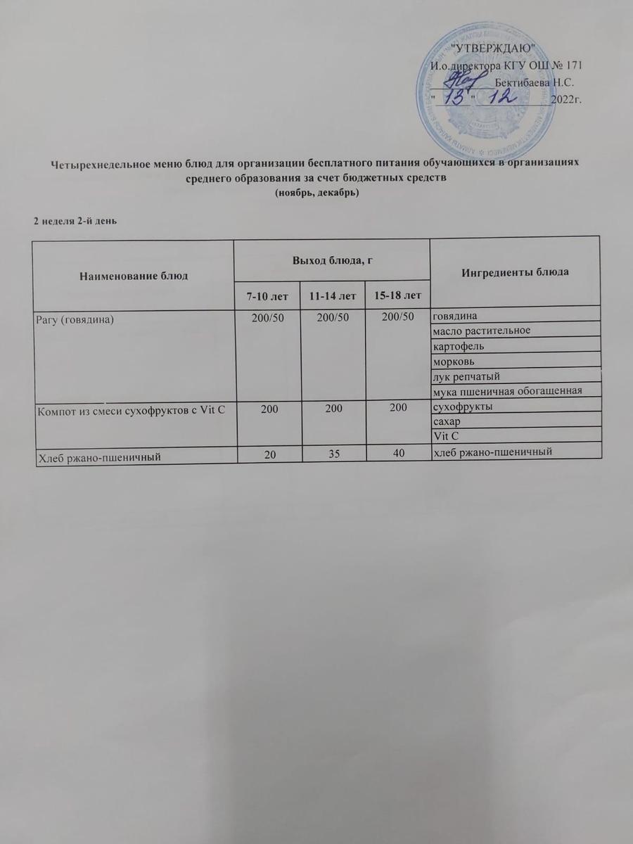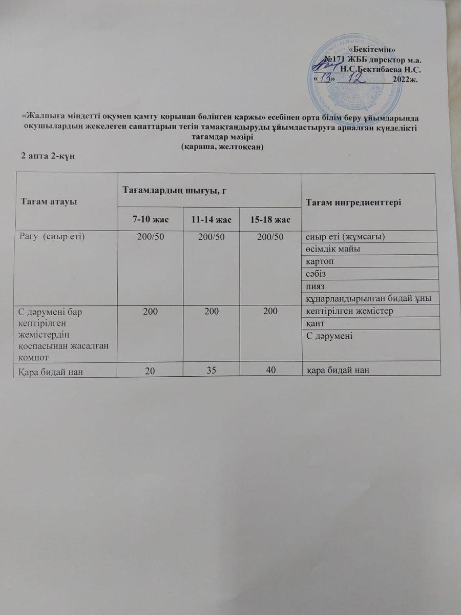 13 декабрь 2022 0 1 2 3 4 5 Тағамдар мәзірі. 2 апта 2 күн (13.12.2022). Меню блюд. 2 неделя 2 день (13.12.2022) Осы беттің QR-коды:QR-код этой страницы: