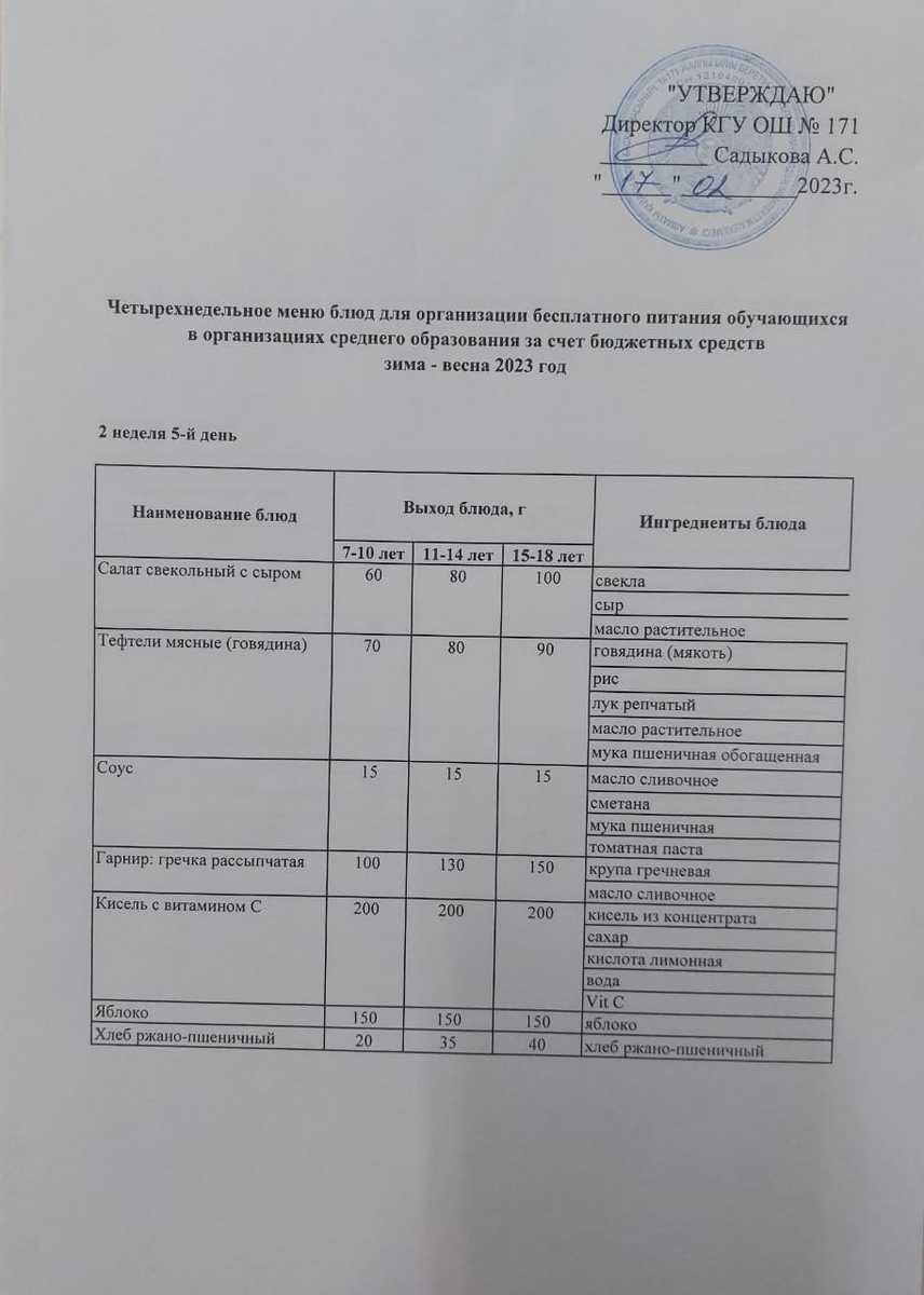 17 февраль 2023 0 1 2 3 4 5 Тағамдар мәзірі. 2 апта 5 күн (17.02.2023). Меню блюд. 2 неделя 5 день (17.02.2023) Осы беттің QR-коды:QR-код этой страницы: