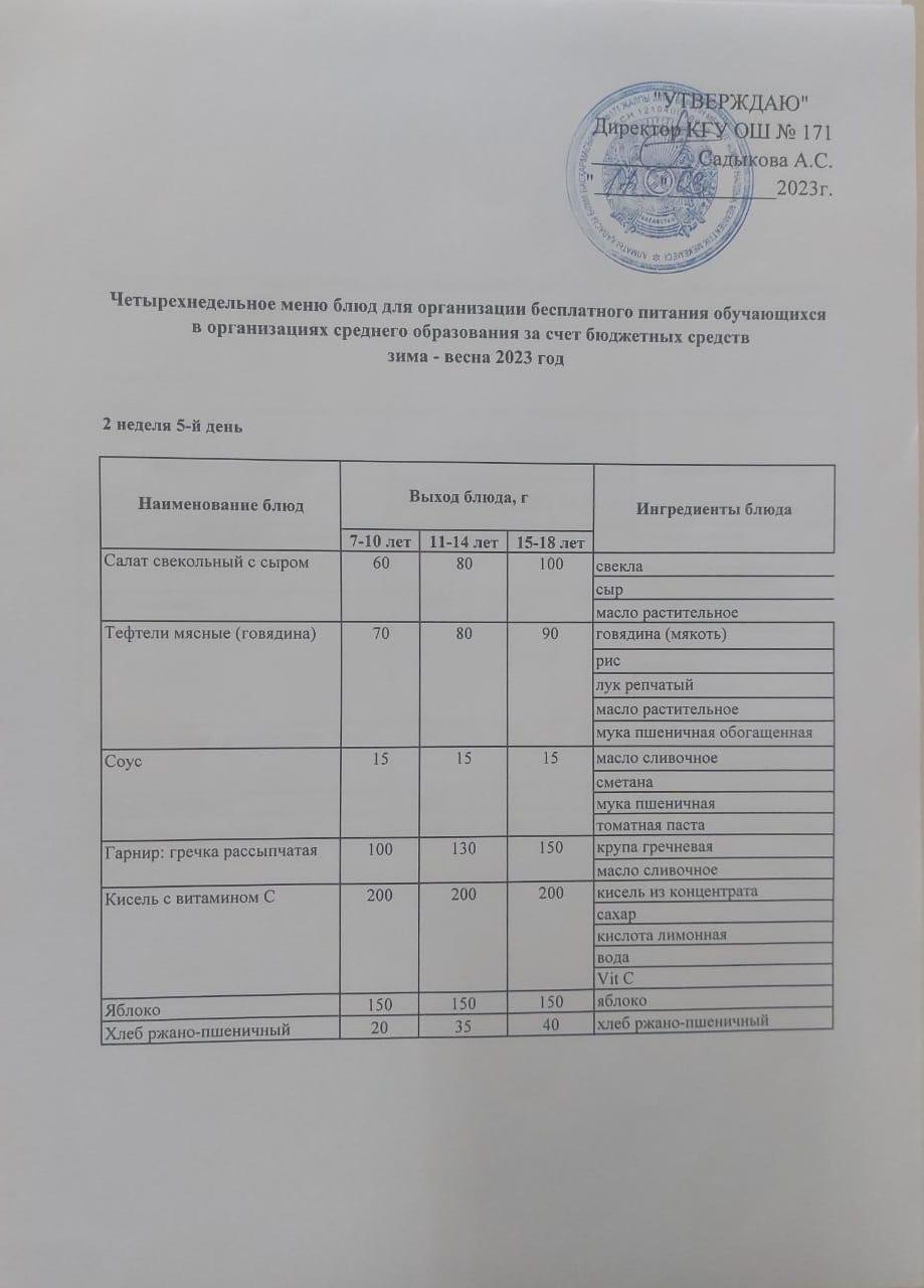 17 март 2023 0 1 2 3 4 5 Тағамдар мәзірі. 2 апта 5 күн (17.03.2023). Меню блюд. 2 неделя 5 день (17.03.2023) Осы беттің QR-коды:QR-код этой страницы: