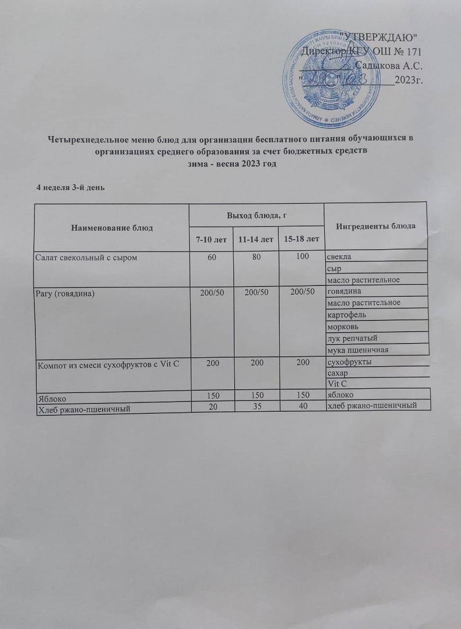 29 март 2023 0 1 2 3 4 5 Тағамдар мәзірі. 4 апта 3 күн (29.03.2023). Меню блюд. 4 неделя 3 день (29.03.2023) Осы беттің QR-коды:QR-код этой страницы: