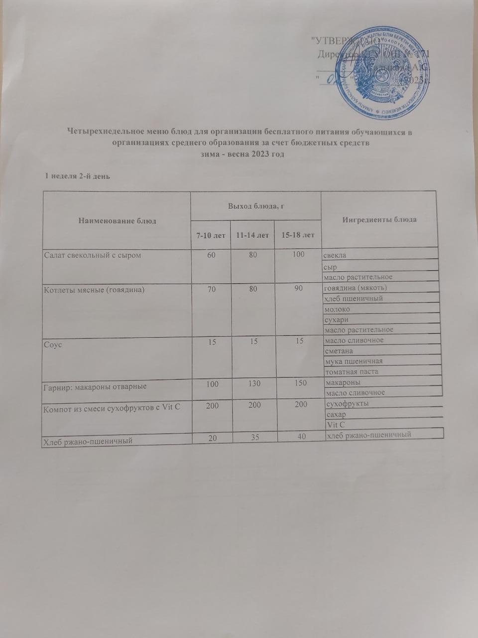 02 май 2023 0 1 2 3 4 5 Тағамдар мәзірі. 1 апта 2 күн (02.05.2023). Меню блюд. 1 неделя 2 день (02.05.2023) Осы беттің QR-коды:QR-код этой страницы: