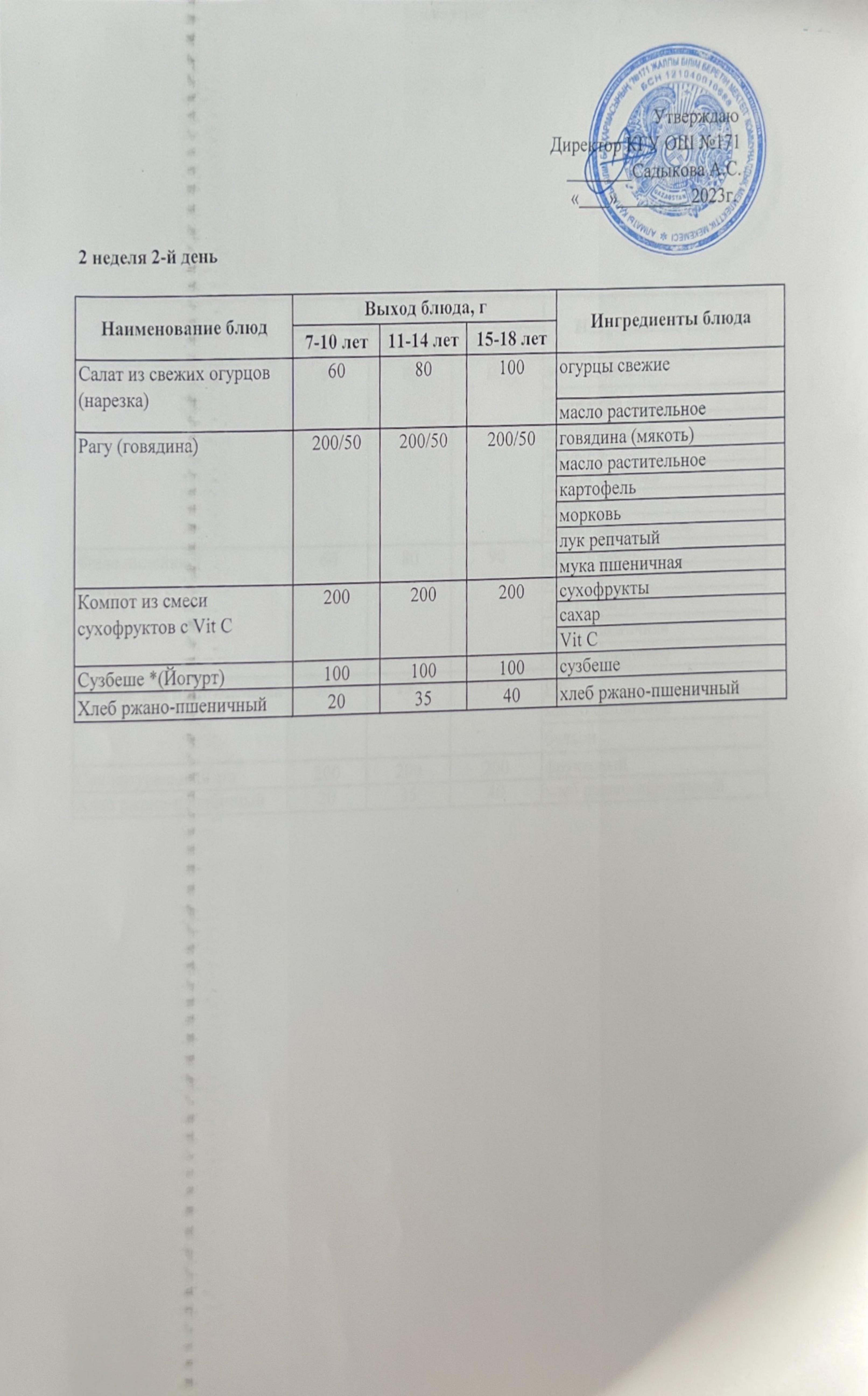 Тағамдар мәзірі. 1 апта 4 күн (09.02.2023). Меню блюд. 1 неделя 4 день (09.02.2023)
