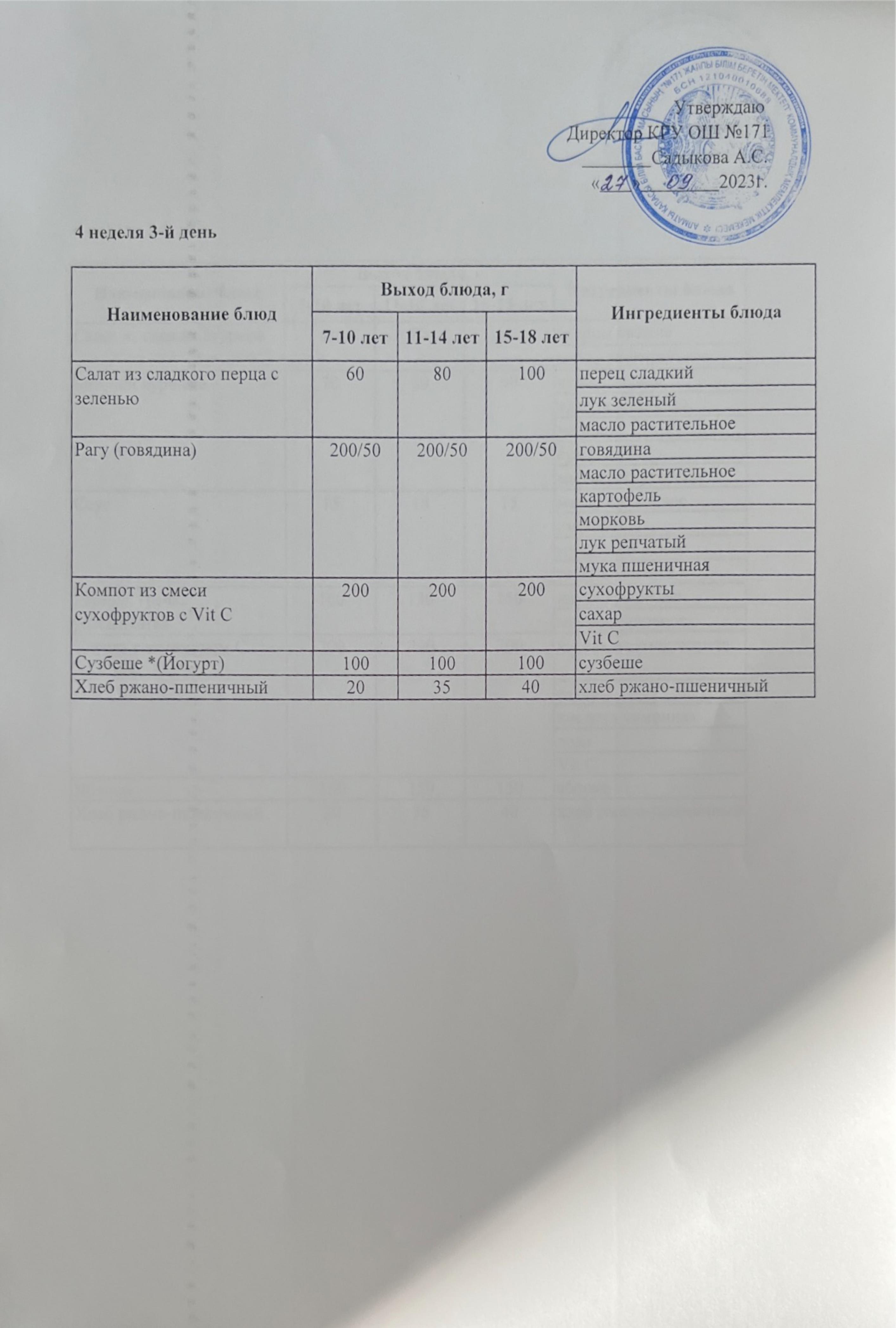 Тағамдар мәзірі. 1 апта 4 күн (09.02.2023). Меню блюд. 1 неделя 4 день (09.02.2023)