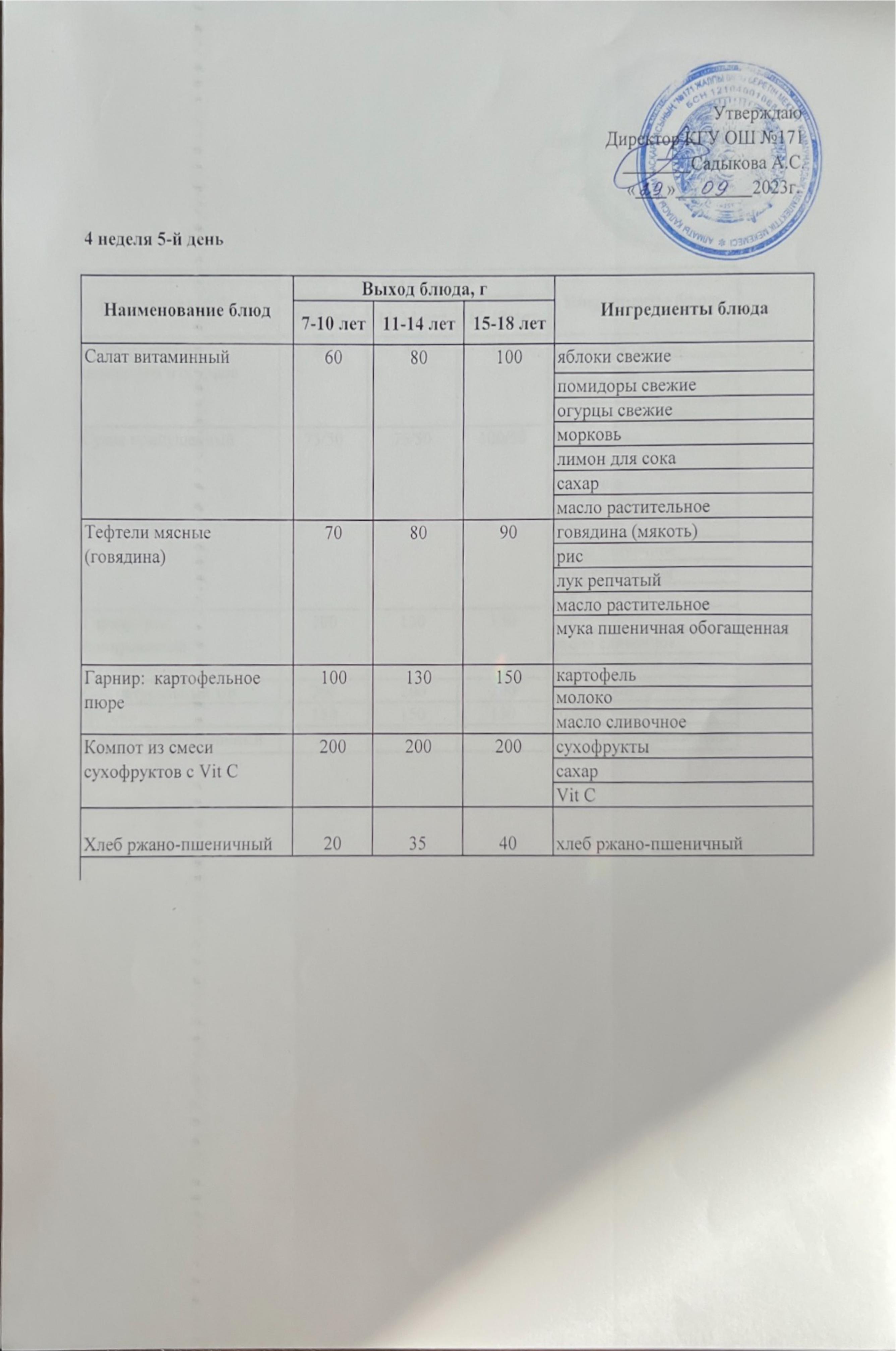 Тағамдар мәзірі. 1 апта 4 күн (09.02.2023). Меню блюд. 1 неделя 4 день (09.02.2023)