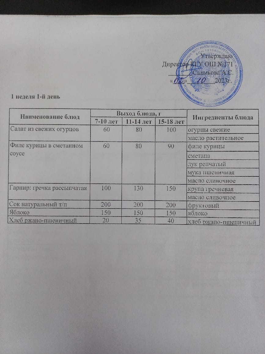 Тағамдар мәзірі. 1 апта 5 күн (02.09.2022). Меню блюд. 1 неделя 5 день (02.09.2022)