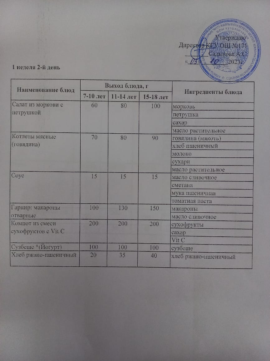 Тағамдар мәзірі. 1 апта 5 күн (02.09.2022). Меню блюд. 1 неделя 5 день (02.09.2022)