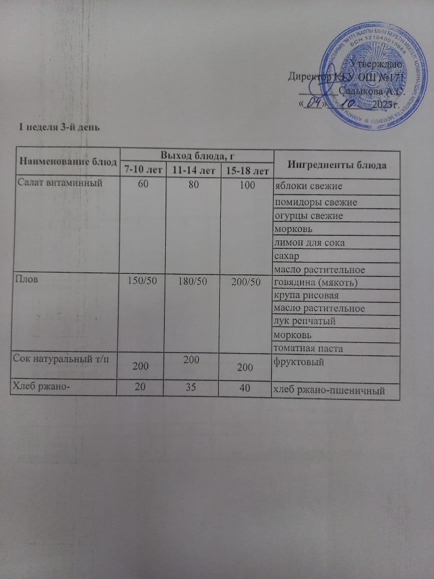 Тағамдар мәзірі. 4 апта 3 күн (01.02.2023). Меню блюд. 4 неделя 3 день (01.02.2023)