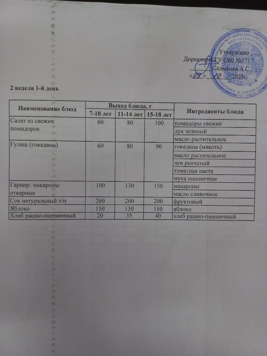 Тағамдар мәзірі. 1 апта 5 күн (02.09.2022). Меню блюд. 1 неделя 5 день (02.09.2022)