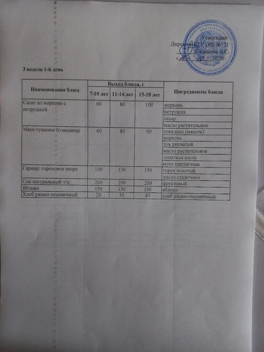 Тағам мәзірі. 3-апта 1-күн