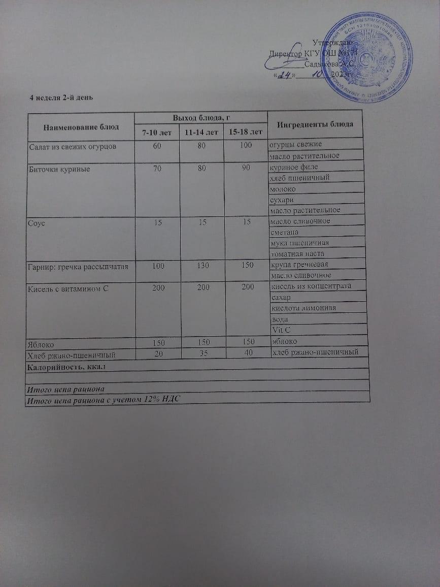 Тағам мәзірі 4-апта 2-күн
