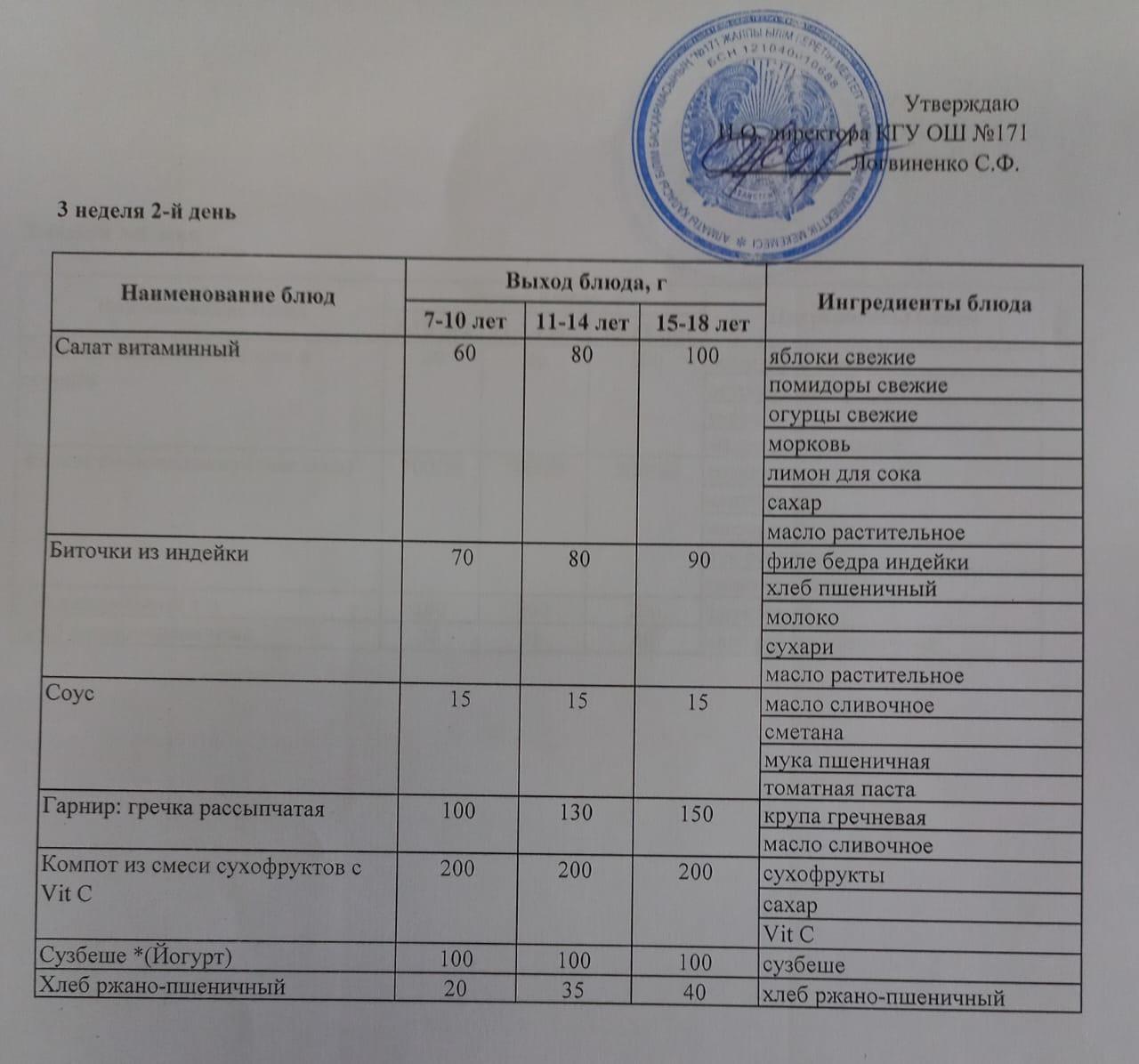 Тағамдар мәзірі. 2 апта 3 күн (15.02.2023). Меню блюд. 2 неделя 3 день (15.02.2023)