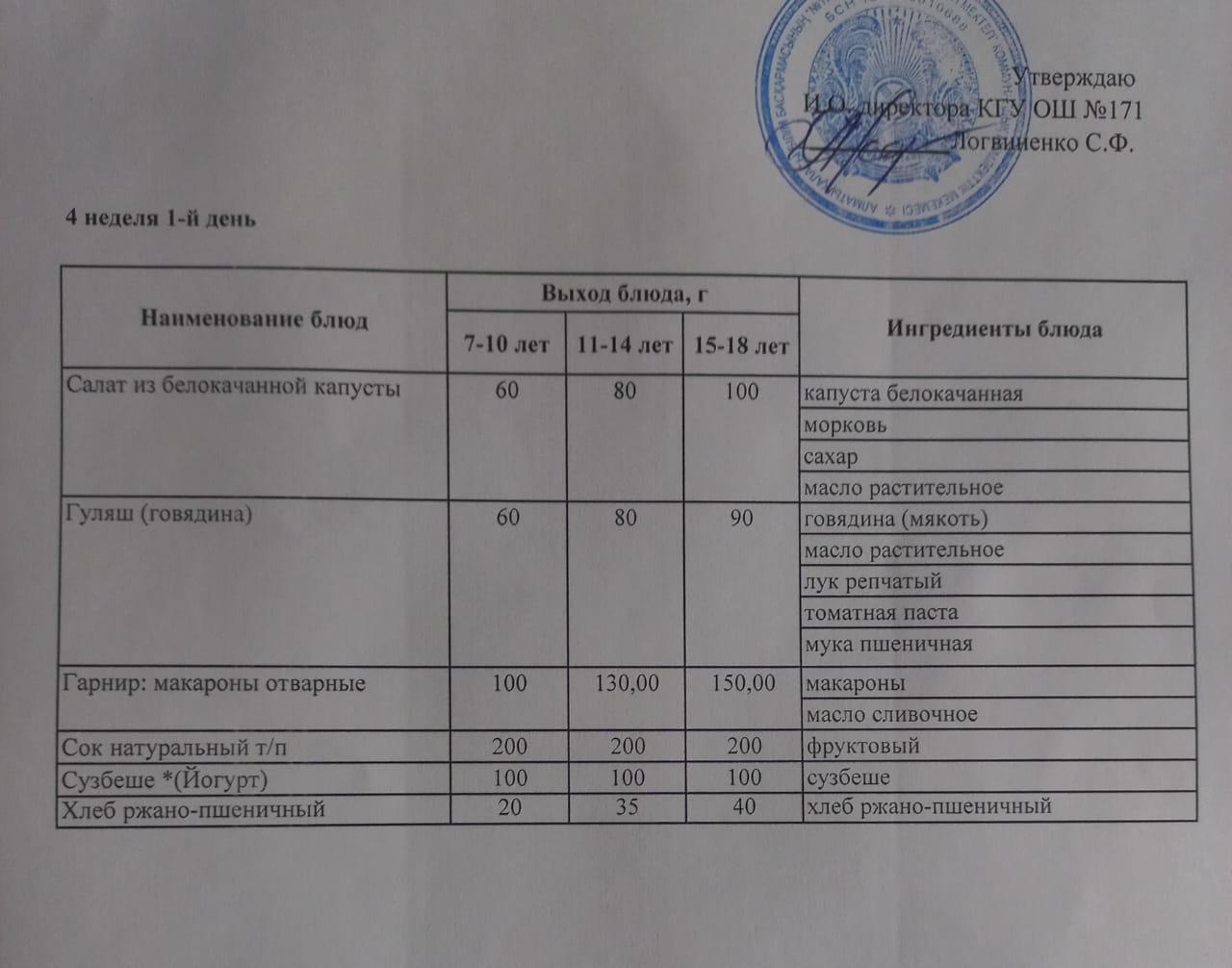 Тағамдар мәзірі. 1 апта 4 күн (09.02.2023). Меню блюд. 1 неделя 4 день (09.02.2023)