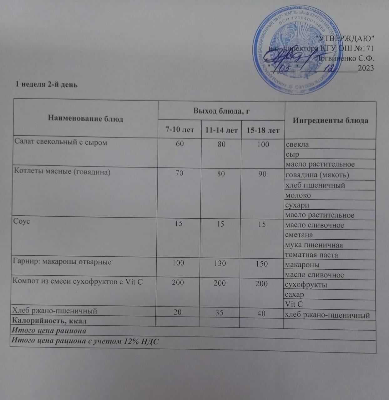 Тағамдар мәзірі. 2 апта 3 күн (15.02.2023). Меню блюд. 2 неделя 3 день (15.02.2023)