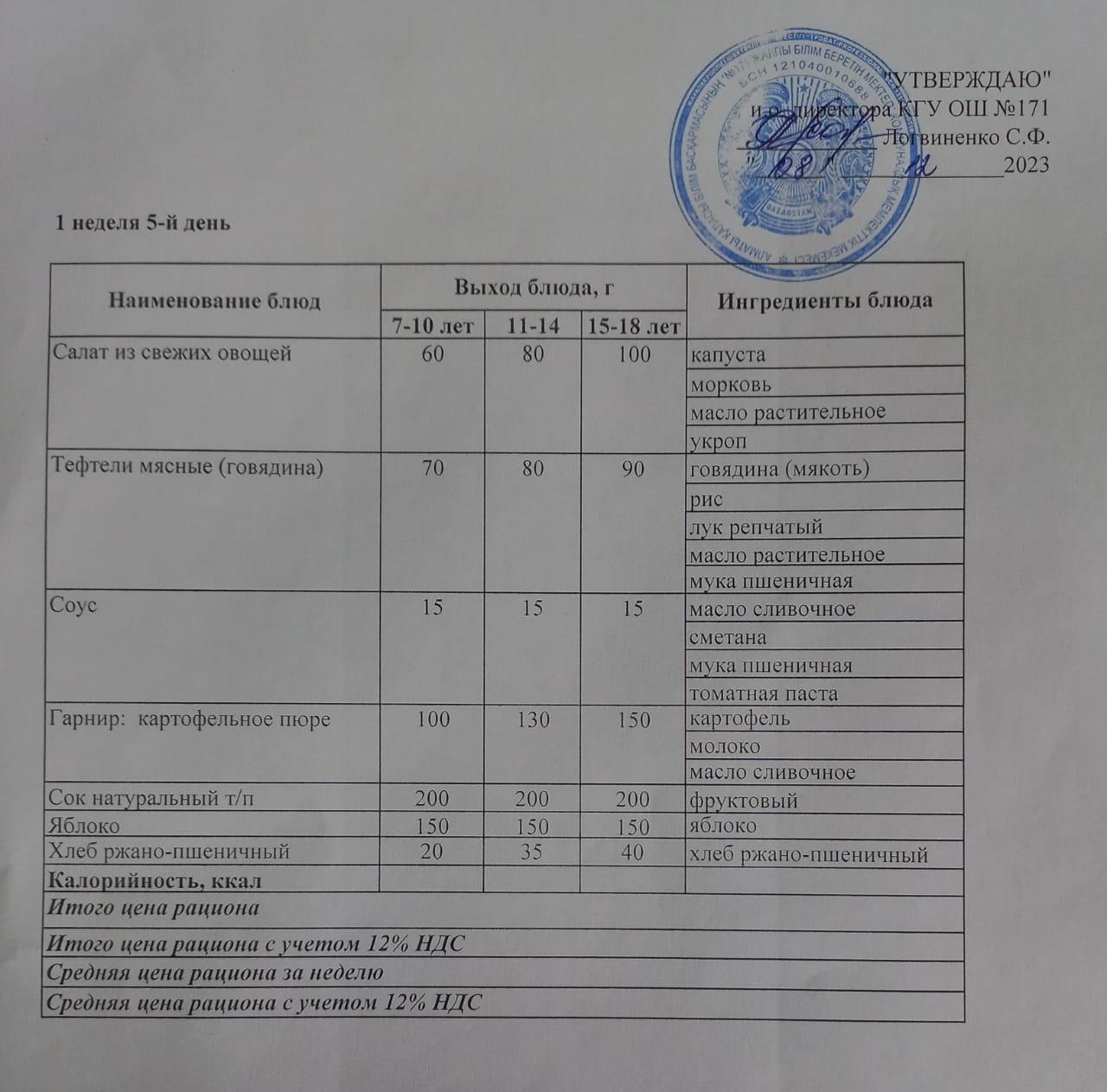 Тағамдар мәзірі. 1 апта 5 күн (02.09.2022). Меню блюд. 1 неделя 5 день (02.09.2022)