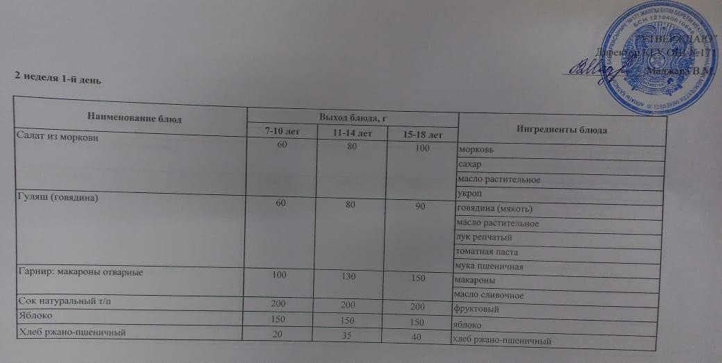 Тағамдар мәзірі. 3 апта 2 күн (21.02.2023). Меню блюд. 3 неделя 2 день (21.02.2023)
