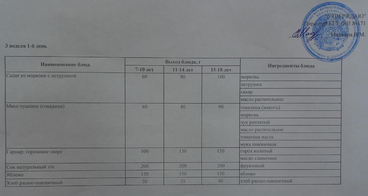 Тағамдар мәзірі. 3 апта 1 күн (20.02.2023). Меню блюд. 3 неделя 1 день (20.02.2023)