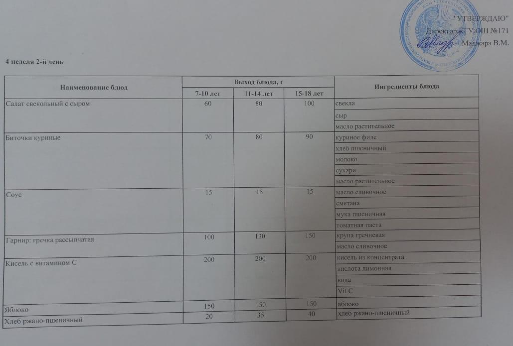 Тағамдар мәзірі. 4 апта 4 күн (02.03.2023). Меню блюд. 4 неделя 4 день (02.03.2023)