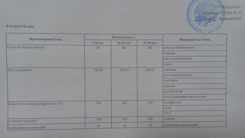 Тағамдар мәзірі. 4 апта 4 күн (02.03.2023). Меню блюд. 4 неделя 4 день (02.03.2023)
