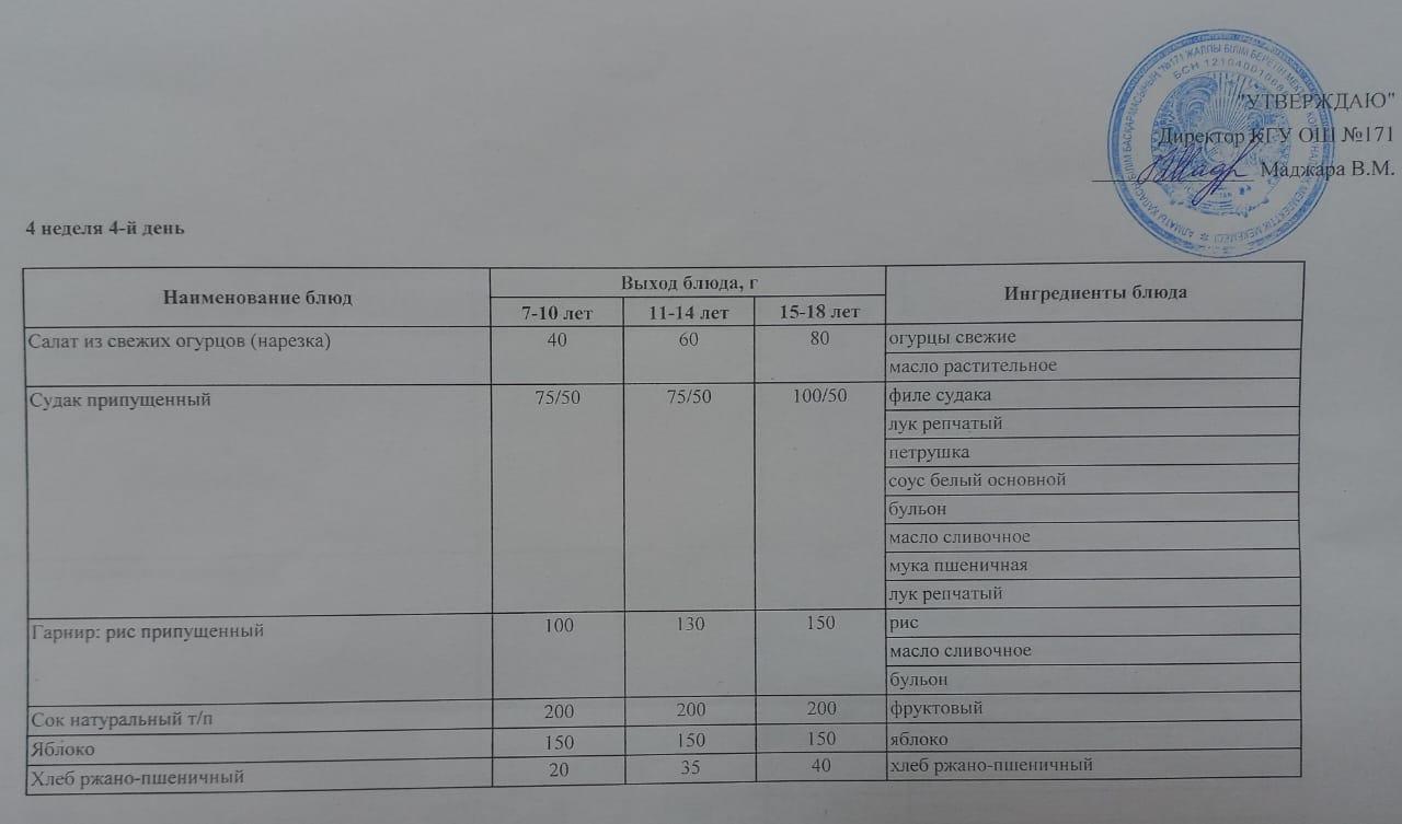 Тағамдар мәзірі. 3-апта 4-күн