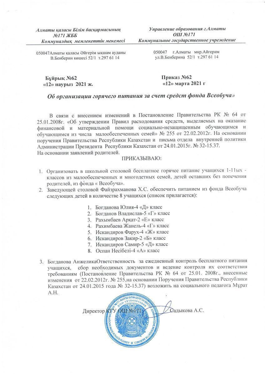 12 март 2021 0 1 2 3 4 5 Приказ №62 "Об организации горячего питания за счет средств фонда Всеобуча" Осы беттің QR-коды:QR-код этой страницы: