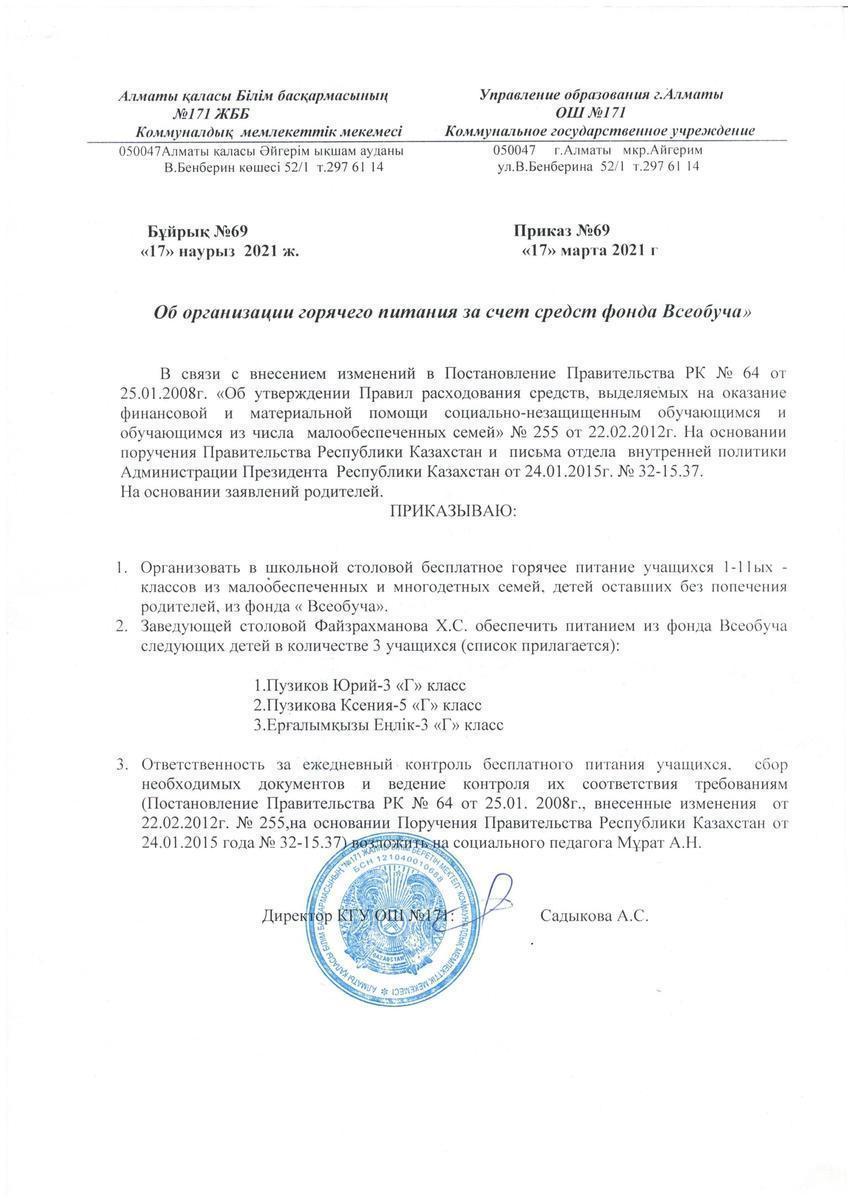 17 март 2021 0 1 2 3 4 5 Приказ №69 "Об организации горячего питания за счет средств фонда Всеобуча" Осы беттің QR-коды:QR-код этой страницы:
