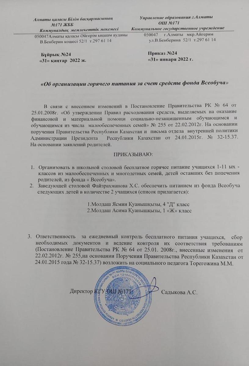 31 январь 2022 0 1 2 3 4 5 Приказ "Об организации горяч.питания за счёт средств фонда Всеобуча" Осы беттің QR-коды:QR-код этой страницы: