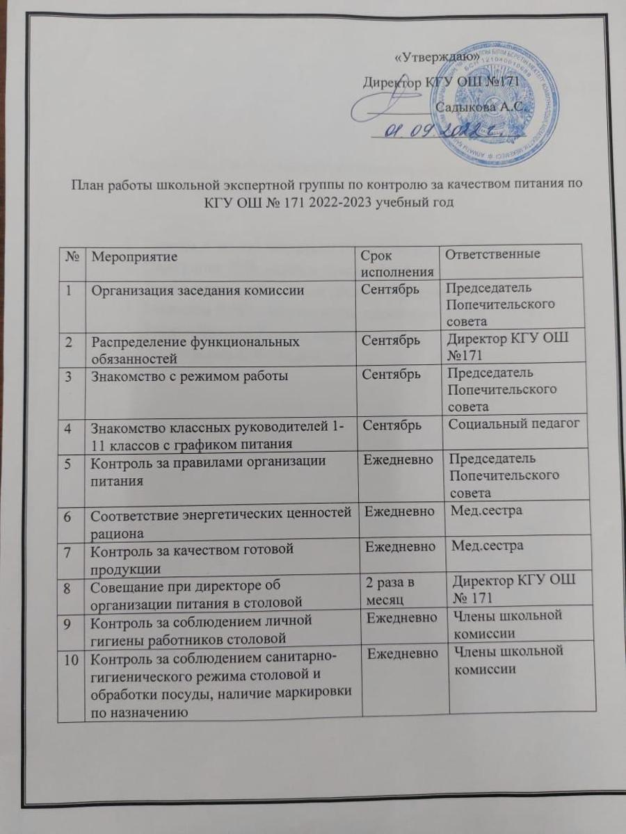 01 сентябрь 2022 0 1 2 3 4 5 План работы школьной экспертной группы по контролю за качеством питания по КГУ ОШ №171 Осы беттің QR-коды:QR-код этой страницы: